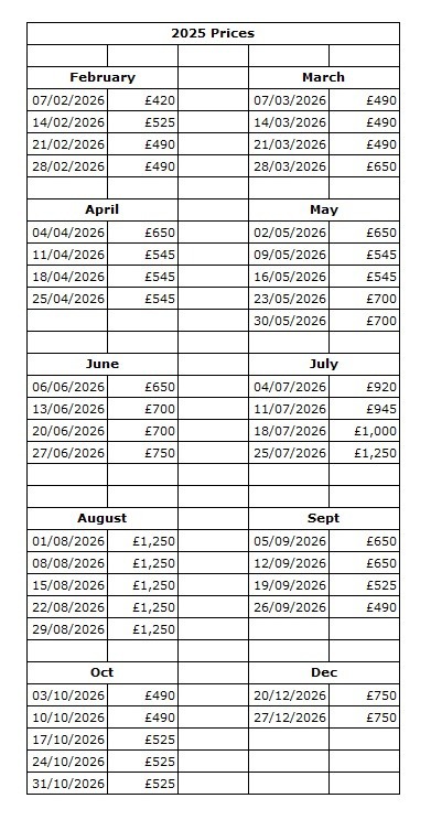 Short breaks available Feb, March, April, May & October Minimum 4 night bookings.