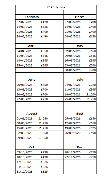 All bookings are per week Saturday to Saturday during main season.